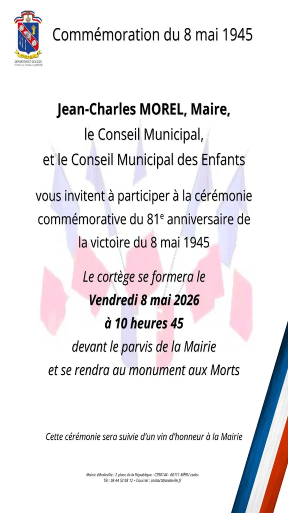 Le cortège se formera le vendredi 08 mai 2026 à 10h45 devant le parvis de la mairie et se rendra au monument aux Morts.