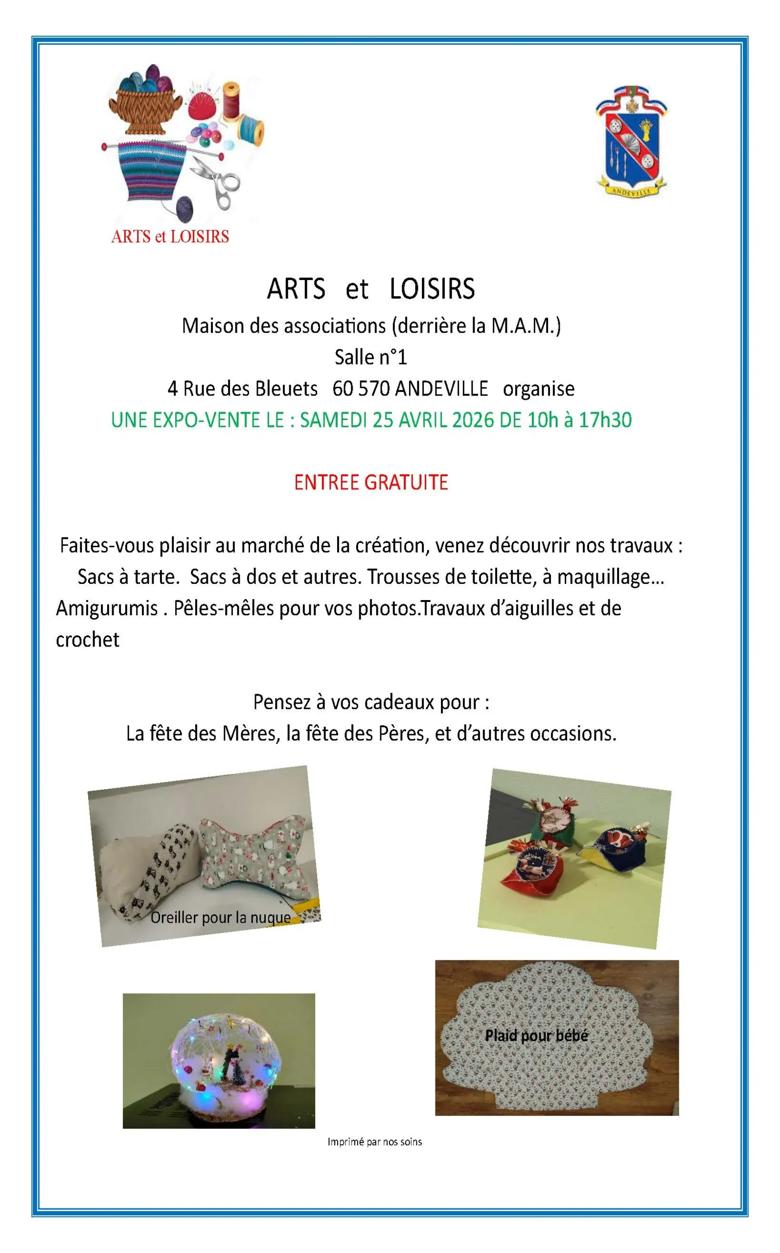 Rendez‑vous le samedi 25 avril 2026 à la Maison des associations (salle N° 1) pour découvrir des réalisations uniques, faites main.
