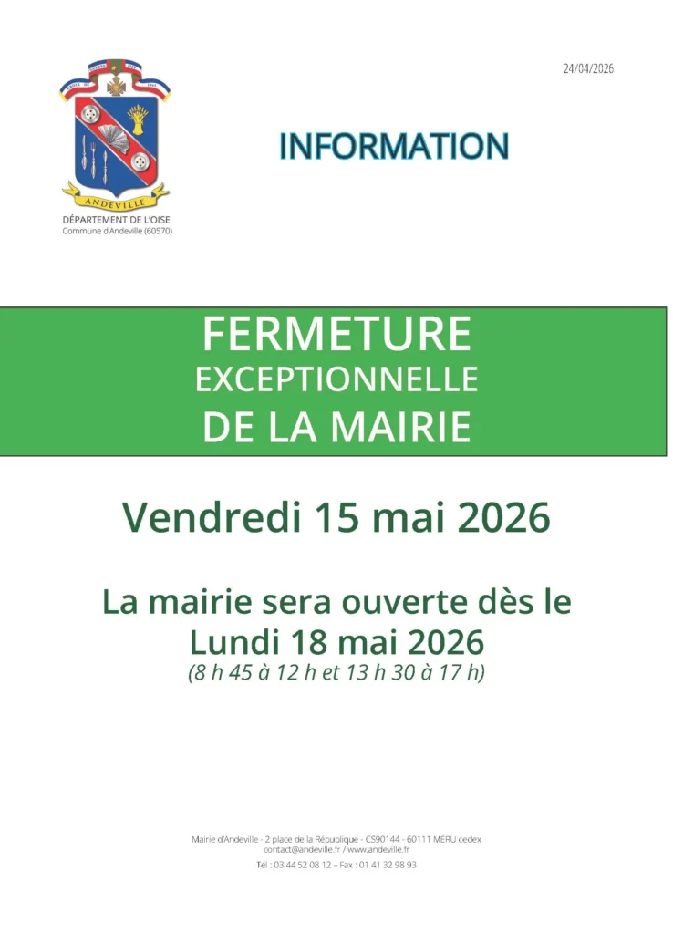 La mairie sera fermée exceptionnellement le vendredi 15 mai 2026